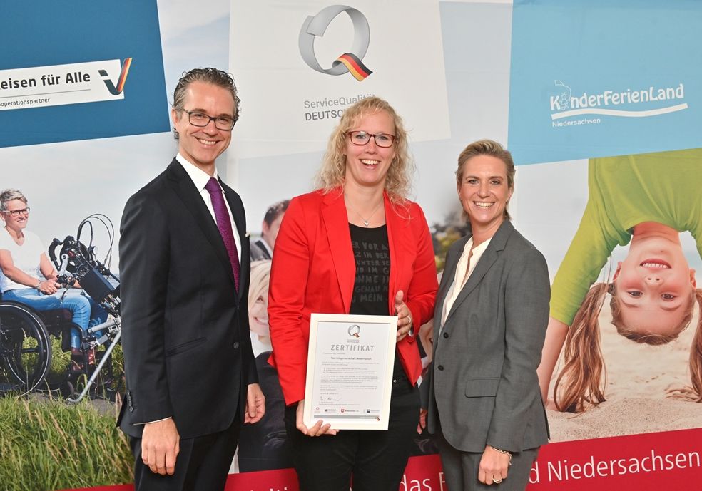 Hannover/Brake. „Wir freuen uns über diese Auszeichnung. Unser Ziel ist es, unsere Dienstleistungsqualität gegenüber unseren Partnern und Gästen stetig zu verbessern“, so Tina Tönjes, Leiterin der Tourismusgemeinschaft Wesermarsch. v.l. Dr. Berend Lindner, Tina Tönjes, Meike Zumbrock.