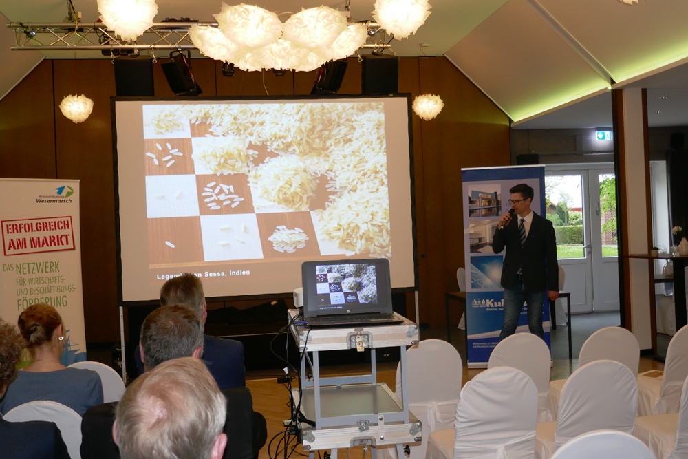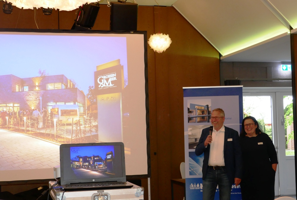 Gastgeber und Veranstaltungsort von „Erfolgreich am Markt“ war das „Gast- und Eventhaus Großenmeer“, das ganz neu eröffnet wurde. Der Ortskern von Großenmeer hat mit dem Neubau und der Sanierung des ehemaligen Saals von Scheeljes Gasthof einen top modernen Treffpunkt erhalten, der durch die Initiatoren André Kuhlmann/Hans-Gerd Kuhlmann GmbH, Godfried van Eijden/van Eijden GmbH & Co. KG, Gerd Röben/Röben GmbH und Jens Ripken/J. Müller AG realisiert wurde. Der Saal kann bis zu zweihundert Personen und ein Nebenraum bis zu 40 Personen beherbergen, vier Gästezimmer stehen ebenfalls zur Verfügung. Ins Gebäude wird demnächst noch ein Café einziehen. Die Freude der Pächterin Olga Yezyeyeva über ihre neue Location teilte sie sich mit der Wirtschaftsförderung. Diese hatte an einem erfolgreichen Förderantrag mitgewirkt. Das Bauvorhaben konnte dadurch von einem noch laufenden Förderprogramm für die integrierte ländliche Entwicklung profitieren.