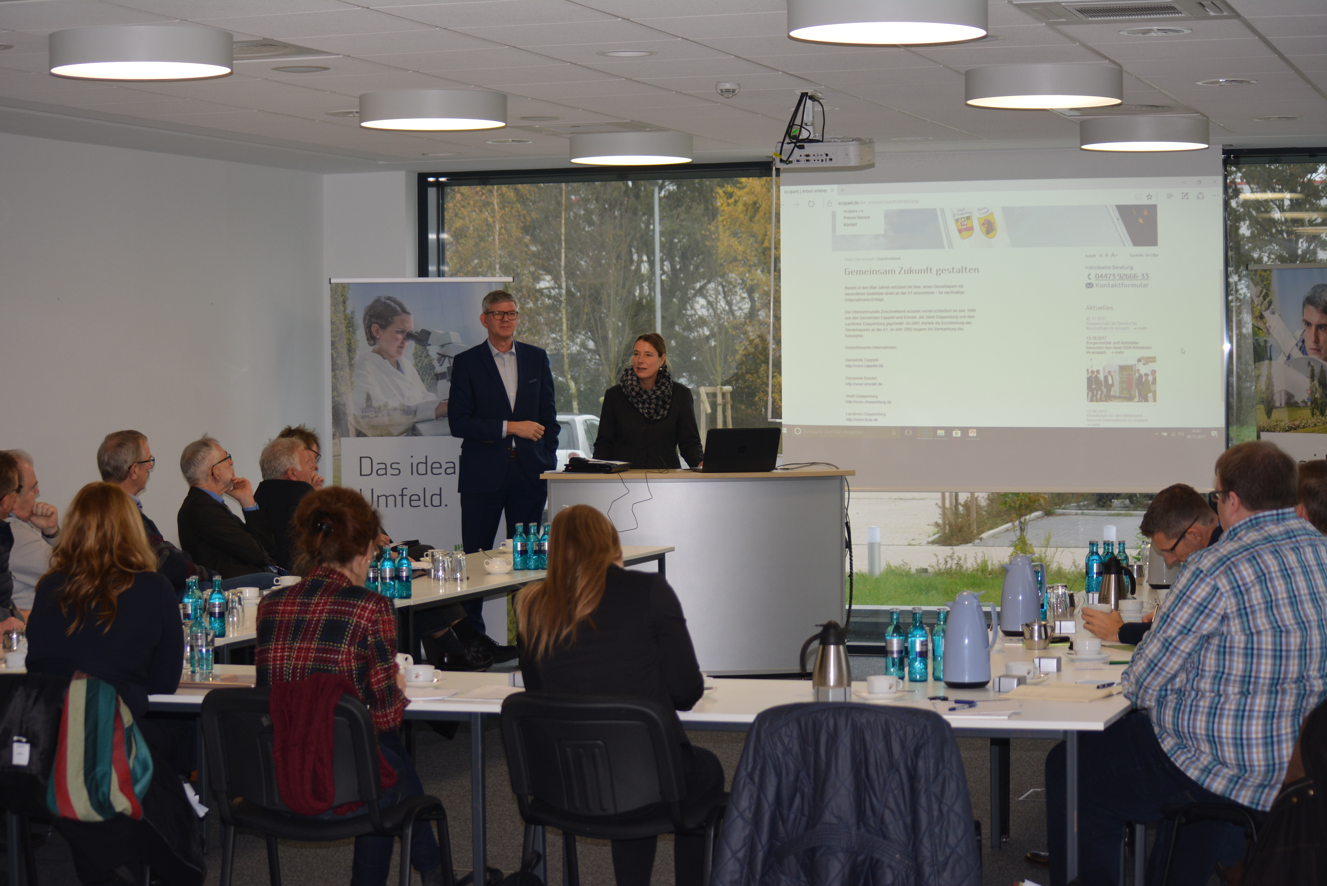 Trotz des gemeinsamen interkommunalen Charakters unterscheiden sich die Gewerbeparks ecopark und c-Port in vielen Hinsichten und boten entsprechend vielseitige Eindrücke. Der Gewerbepark ecopark liegt mitten im Oldenburger Münsterland an der Hansalinie A1 und stellt das Thema „Arbeit erleben“ in den Vordergrund. Das Team um Uwe Haring, dem Geschäftsführer des ecopark, fokussiert sein Angebot in erster Linie auf zukunftsorientierte Unternehmen und bietet diesen attraktive Gewerbeflächen in einer schönen Landschaftsgestaltung, in der die Mitarbeiter durch ein modernes Arbeitsumfeld nicht nur mehr Arbeitsqualität, sondern zugleich mehr Lebensqualität erleben. Dieser ansprechende Rahmen kostet interessierte Unternehmen 42 Euro pro Quadratmeter mit der Möglichkeit, auch die angrenzenden Flächen direkt für sich zu reservieren.