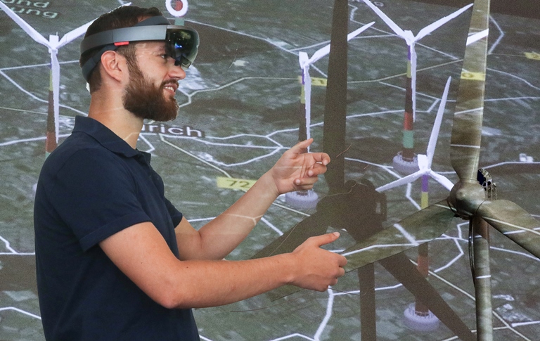 Oldenburg. Es sieht aus, als würde Jannick Asmuß eine Skibrille tragen. Aber das macht im Büro der Zeit GmbH, die im Technologie- und Gründerzentrum Oldenburg angesiedelt ist, wenig Sinn. Was Asmuß dort trägt, ist eine sogenannte „HoloLens“. Dabei handelt es sich um eine 3D-Brille, die die reale Welt um weitere Informationen ergänzt. In der Fachsprache heißt das „Augmented Reality“. Und im Fall von Asmuß bedeutet es, dass er sich eine Windparkanlage ansehen kann, ohne vor Ort zu sein. Er kann sich durch die ganze Anlage navigieren, sieht die realen Wetterbedingungen vor Ort und kann zu jeder einzelnen Anlage technische und betriebswirtschaftliche Informationen abrufen.
