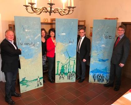 Zur Freude von Ilka Morr, Geschäftsführerin der Stiftung Lebensräume, wurden nun die Bilder in ihren Räumen offiziell durch den Geschäftsführer der Wirtschaftsförderung Wesermarsch GmbH, Jens Wrede, übergeben. Und Astrid Grotelüschen konnte im Gegenzug ihre Auktionssumme der gemeinnützigen Stiftung aushändigen. „Zwar wird damit das Triptychon unwiderruflich „aufgelöst“ sein“, so Wrede, „aber es freut uns sehr, dass Wind-Weite-Wesermarsch nun dauerhaft im Rathaus derGemeinde Ovelgönne und im Bürgerbüro von Astrid Grotelüschen einen öffentlichen Platz finden werden.“