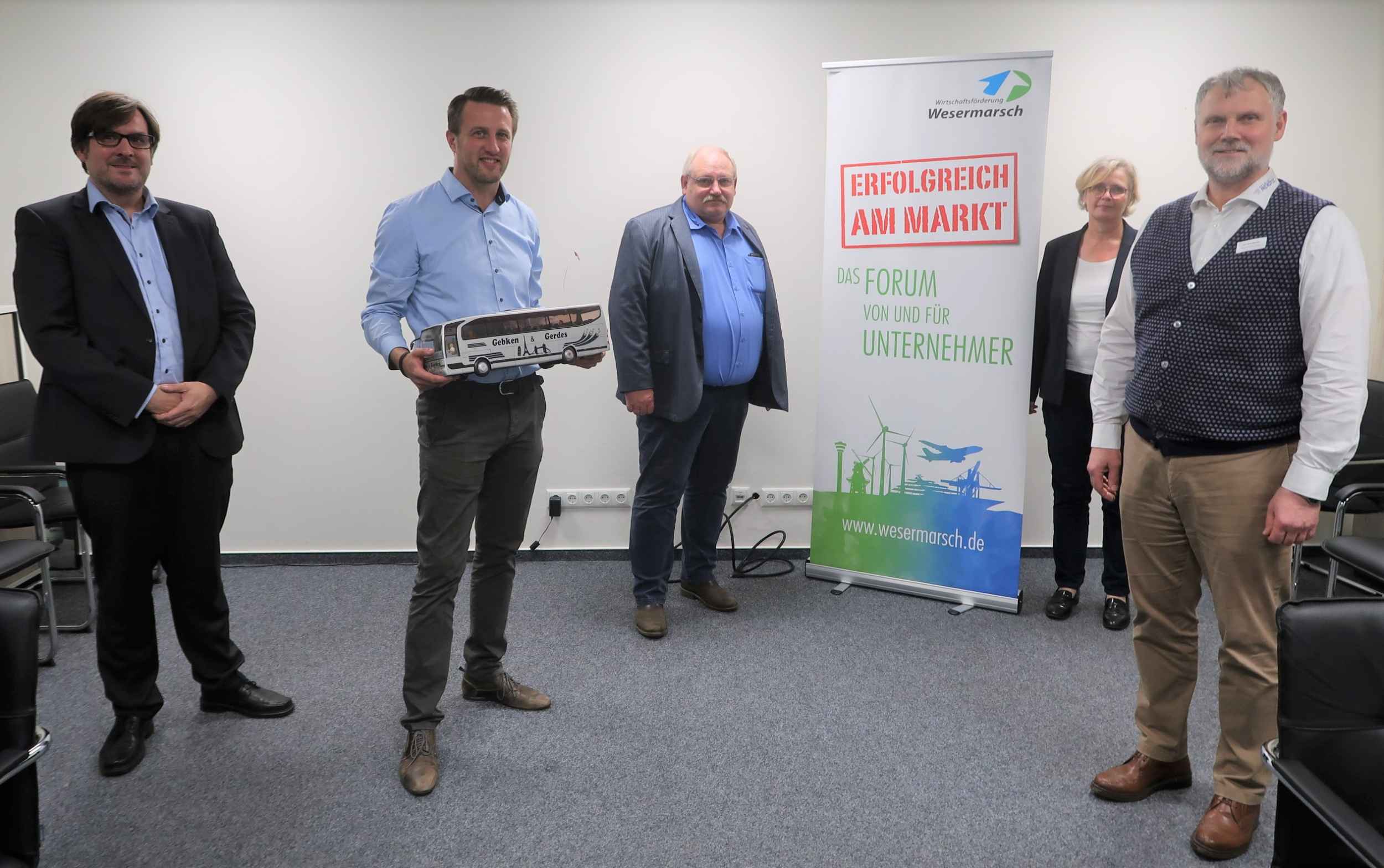 Auf dem Foto: Erfolgreich am Markt war bei der Firma Gebken & Gerdes zu Gast. V.l.n.r.: Nils Siemen/Wirtschaftsförderung, Sebastian Strehlau und Lutz-Rainer Gebken von Gebken & Gerdes, Raphaela Gerdes-Schmidt/Wirtschaftsförderung und Dirk Schumacher/ PAG GmbH.