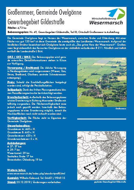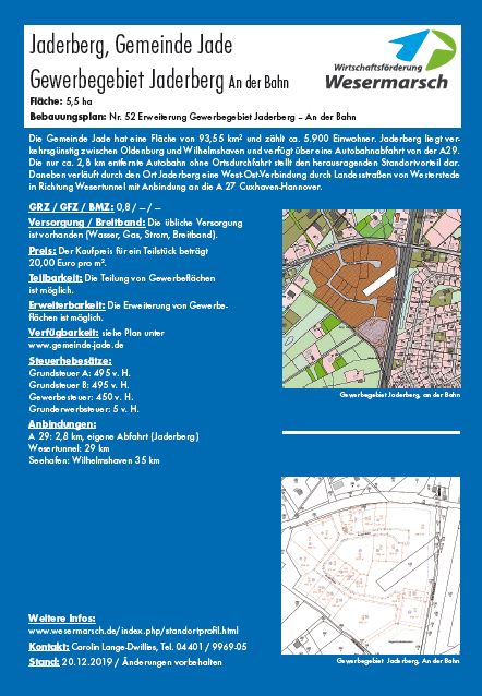 Die aktuelle Gewerbeflächenbroschüre enthält detaillierte Informationen zu unseren gesamten Flächenportfolio und bietet Interessenten u. a. fundierte Daten zu Verkehrsanbindungen, potenziellen Nutzungsarten und Grundstückspreisen. Besonders die drei Gewerbegebiete Großenmeer-Gildestraße und Jaderberg-An der Bahn sowie der Industriepark Blexen zeigen die ausgeprägte Bandbreite an Flächen der Wesermarsch auf.