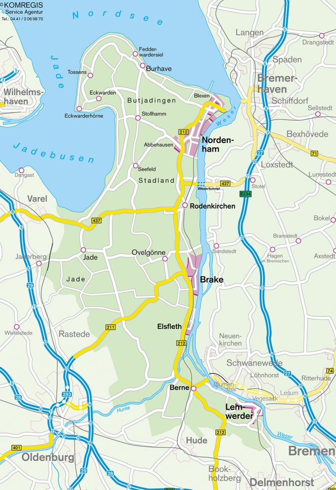 Als zukunftsorientierter Investitionsstandort im Umfeld der vier städtischen Zentren Bremen, Bremerhaven, Oldenburg und Wilhelmshaven liegt der Landkreis Wesermarsch zwischen Nordsee, Jadebusen und Weser im Nordwesten Niedersachsens. Dem 822 km² großen Landkreis Wesermarsch mit seinen rund 90.000 Einwohnern gehören sechs Gemeinden (Berne, Butjadingen, Jade, Lemwerder, Ovelgönne, Stadland) und drei Städte an (Brake, Elsfleth, Nordenham).