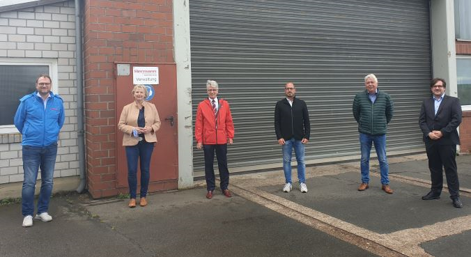 BU: Timon Harms (l.) und Geschäftsführer Günther Hastaed (3.r.) bekamen am ihrem neuen Standort Besuch durch die Landtagsabgeordnete Karin Logemann sowie Michael Kurz (Bürgermeister Stadt Brake), Uwe Seyberth (2. Bürgermeister) und Nils Siemen (Wirtschaftsförderung).